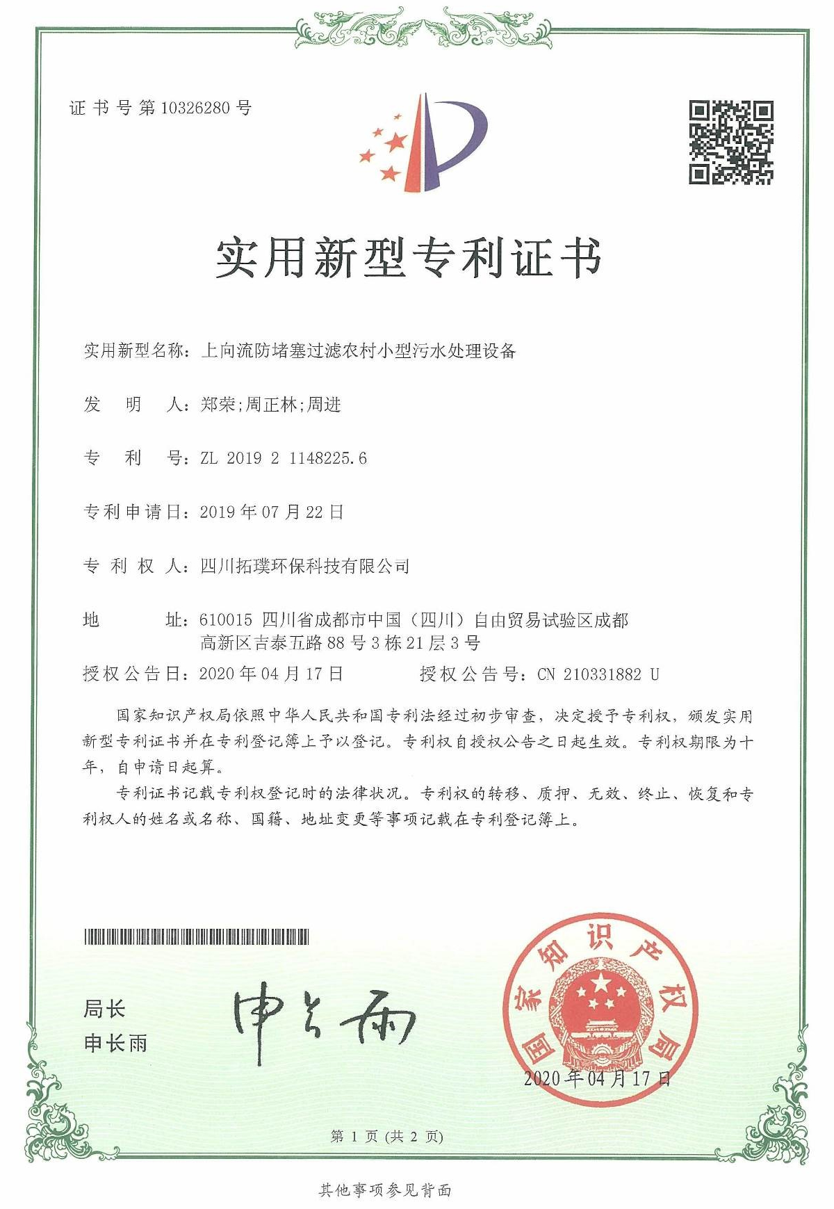實用新型專利證書