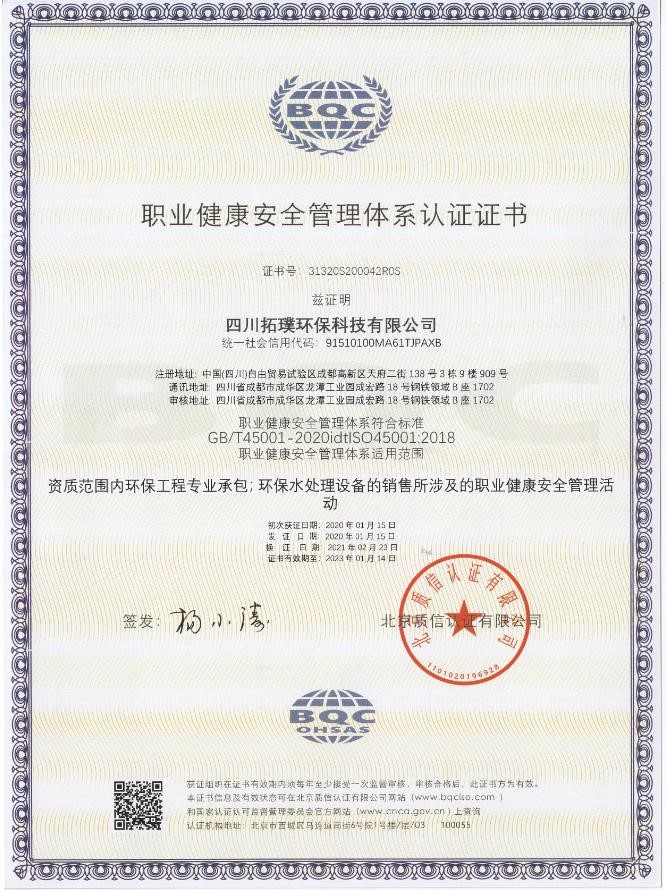 職業(yè)健康安全管理體系認證證書